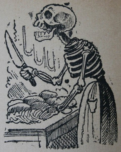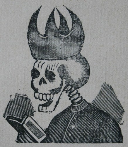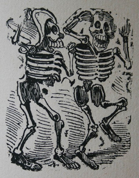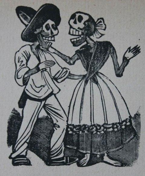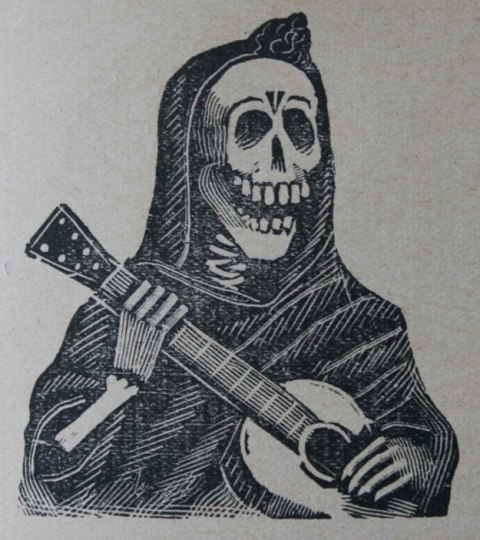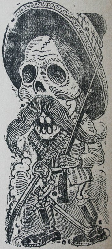 The etchings of José Guadalupe Posada (1852-1913) demonstrated a worldview that was, and often still is, profoundly Mexican.  A commercial illustrator who also printed political broadsides, Posada invented the ‘calavera’ portrait.  Calavera means skull, and by extension, skeleton.  Aspects of the nation’s Indigenous heritage (skulls and death-goddesses were central to Aztec and Maya cultures) plus its Spanish cultural inheritance (death-oriented monastic orders, the ‘dance of death’ and ‘memento mori’ traditions) combine in Posada’s rustic yet sophisticated prints to give us the flavour of the average Mexican’s stoical yet humorous appreciation of Death.