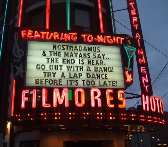 ZP_Dicen Nostradamus y los Mayas que Nos Acerca El Fin. Sal con un gran pum. Disfrútate con un baile erótico del regazo, antes de que esté demasiado tarde…Sunset, December 20th 2012_Marquee of a Striptease Tavern in Toronto, Canada_A light touch concerning the gravitas of 21.12.2012 !