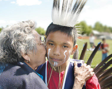 Bottom photograph: An Elder congratulates a boy upon his completion of Grade 6 at an Awasis Day event in Edmonton, Alberta_June 2005.