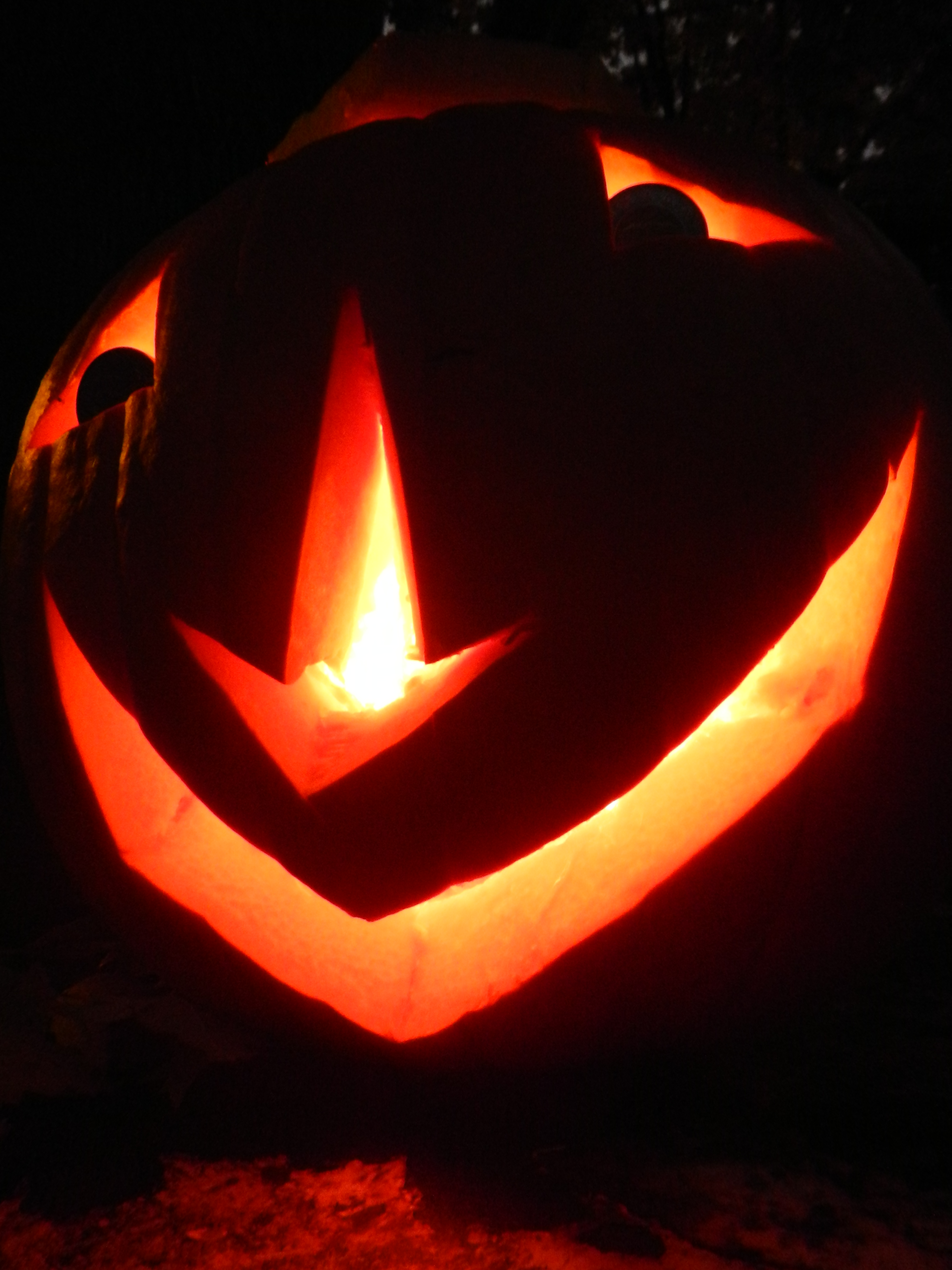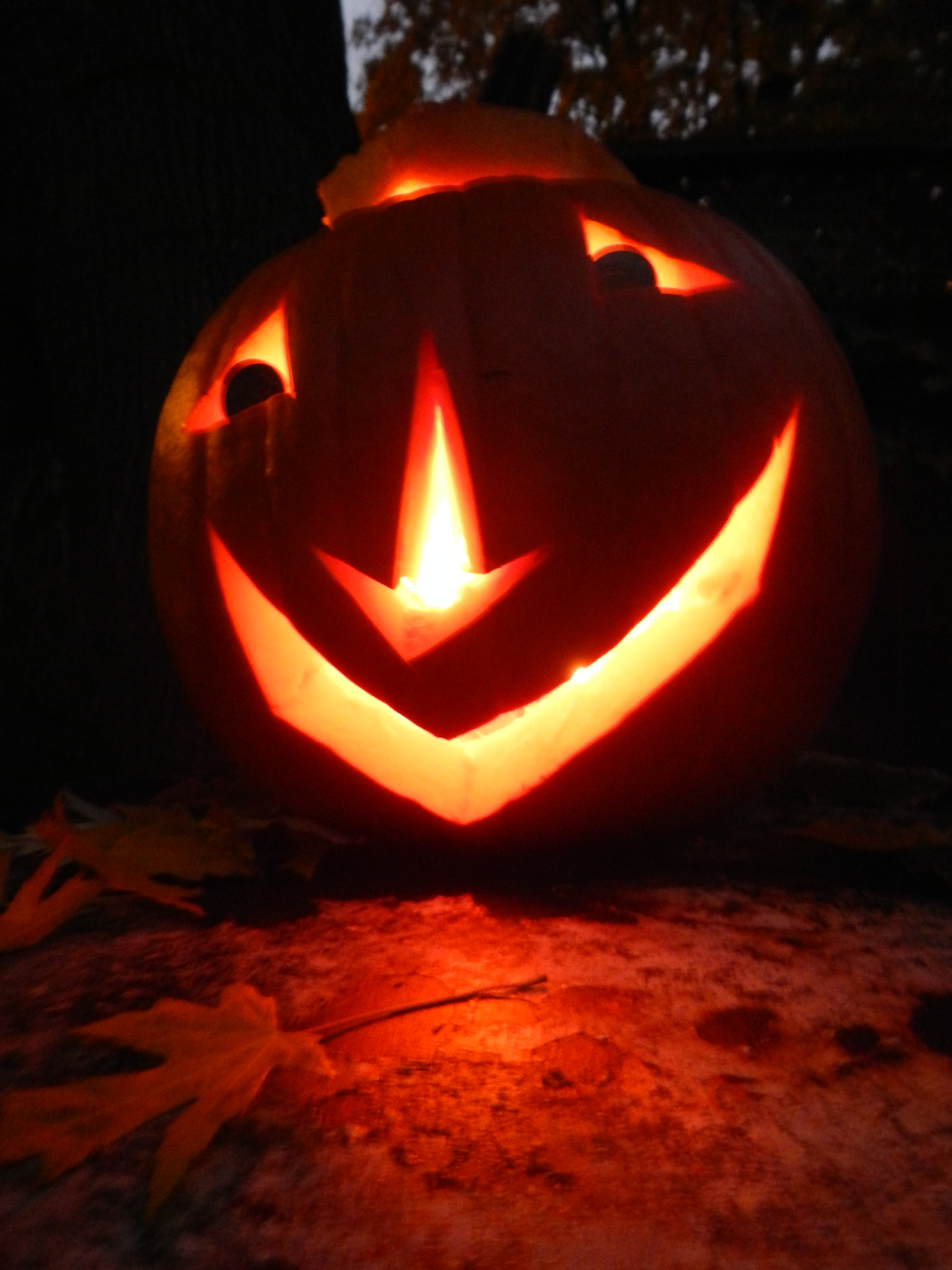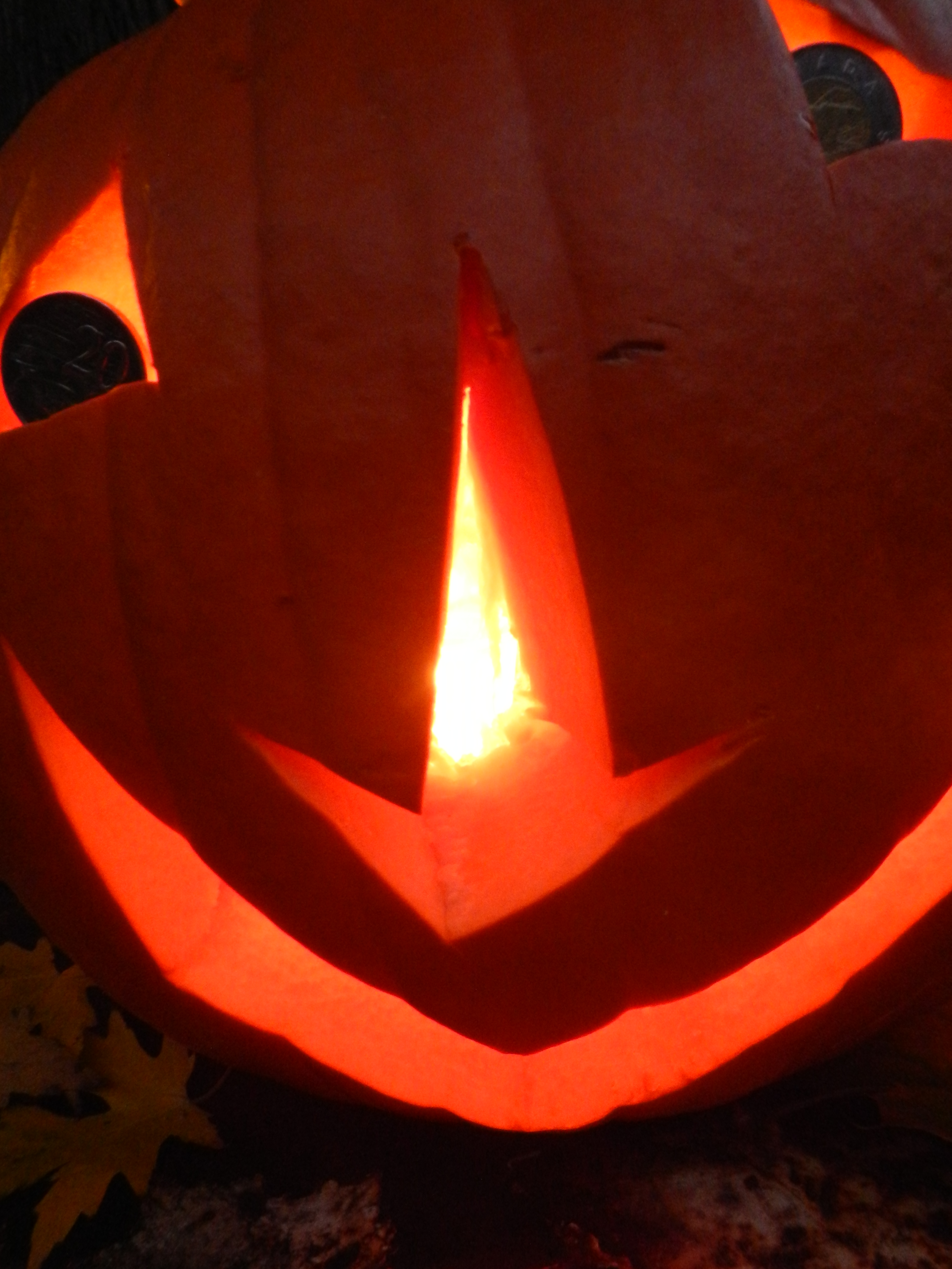 The origin of Jack-o’-Lantern carving is in Ireland, and the pre-Christian festival of Samhain.  Samhain (which is the Gaelic word for November) hinges on the end of the harvest / Celtic old year, and the beginning of Winter / Celtic new year.  For a few hours all Spirits, including our ancestors, may run free, back and forth between “this” world and the “other”).  In old Eire it was the dependable turnip that was hollowed out, and a candle placed within. Positioned at a cottage threshold, or upon a window ledge, the glowing turnip “face” would announce to roving Spirits – some of which might’ve meant harm – that this was a house protected and not to be tampered with. Sometimes coins were inserted as “lucky eyes”, in case any malevolent invisible-now-visible Beings of Samhain needed to steal something away: better they take two pieces of silver than to carry off a calf or sicken to death the smallest child.