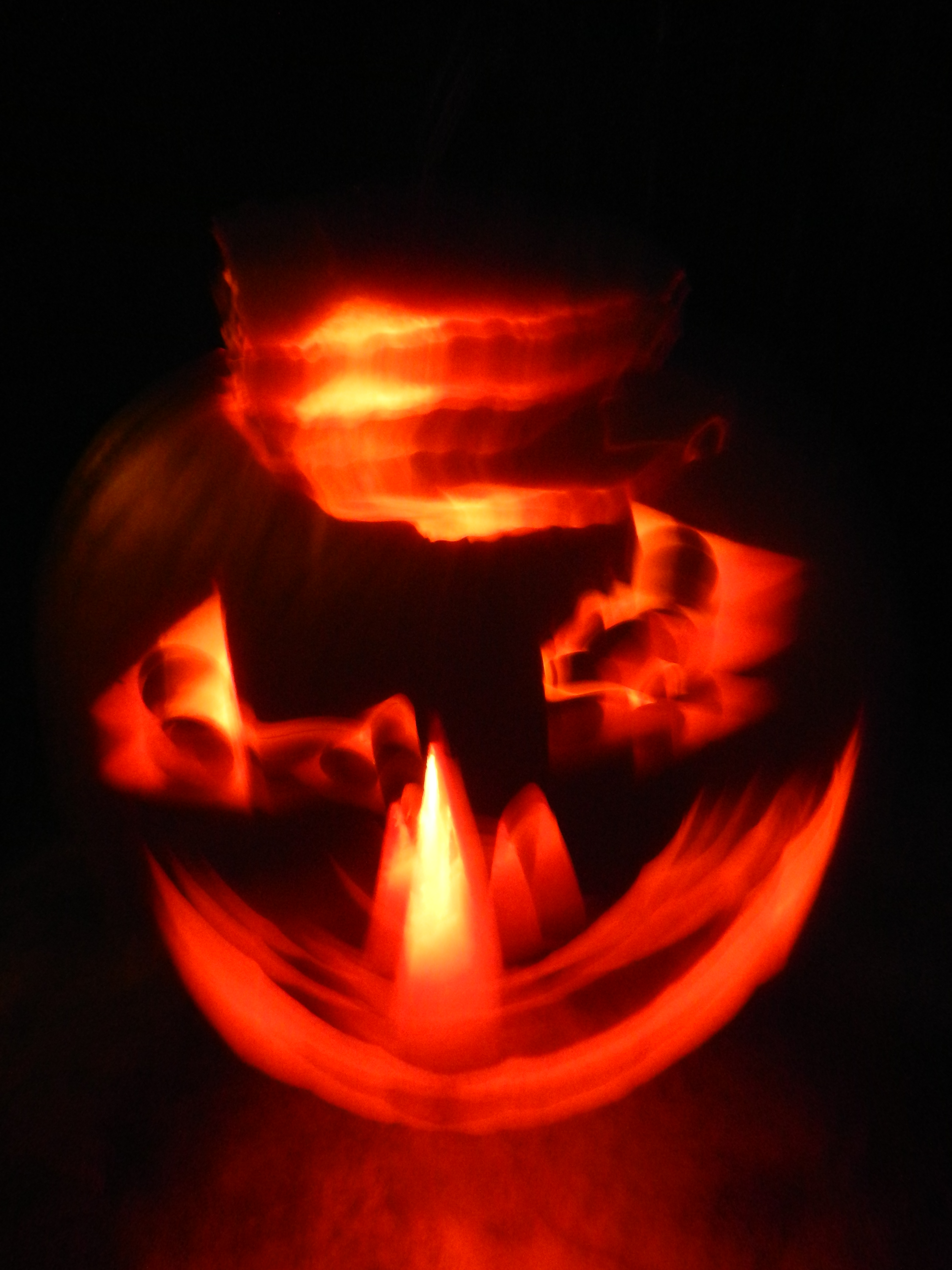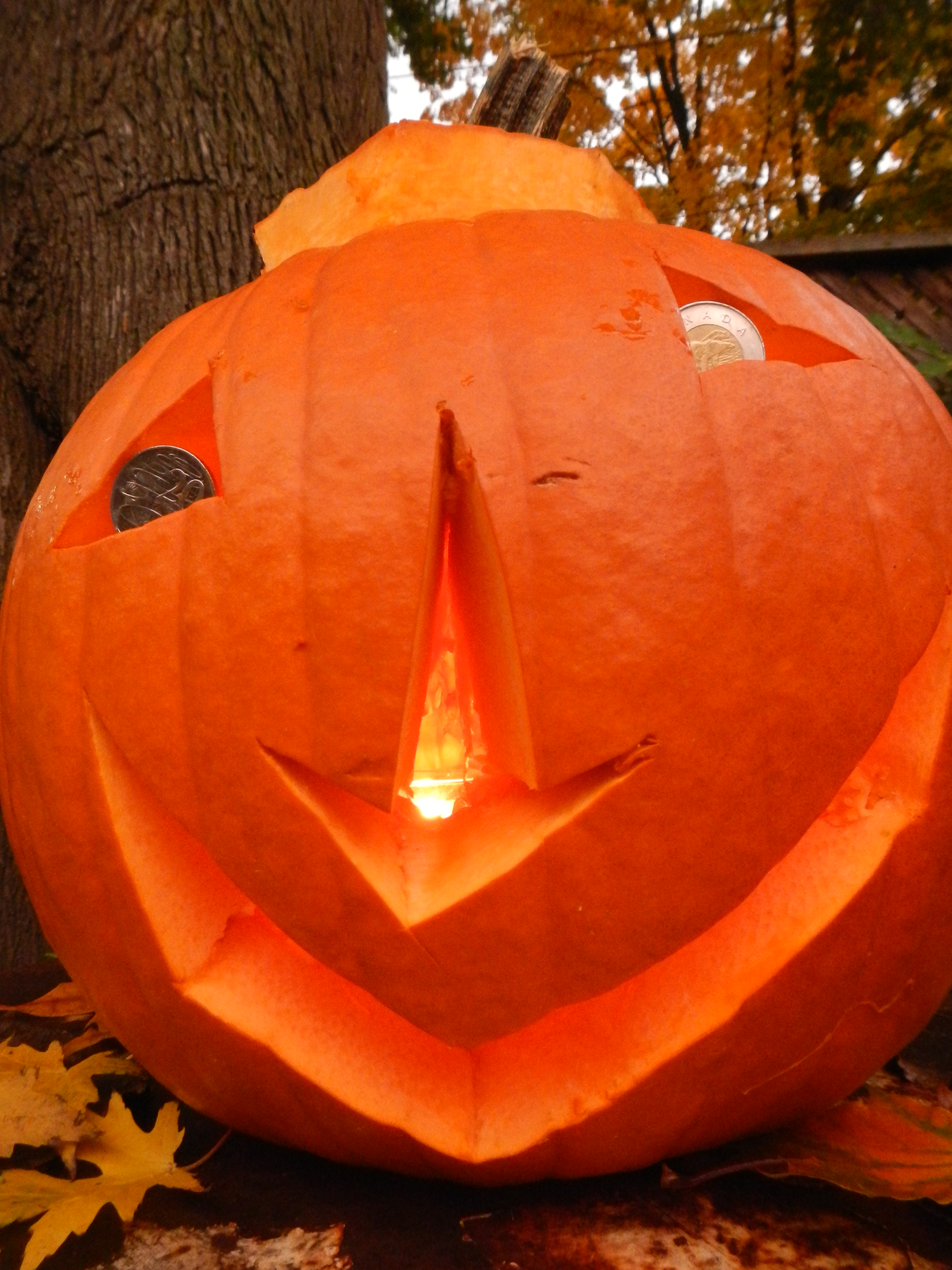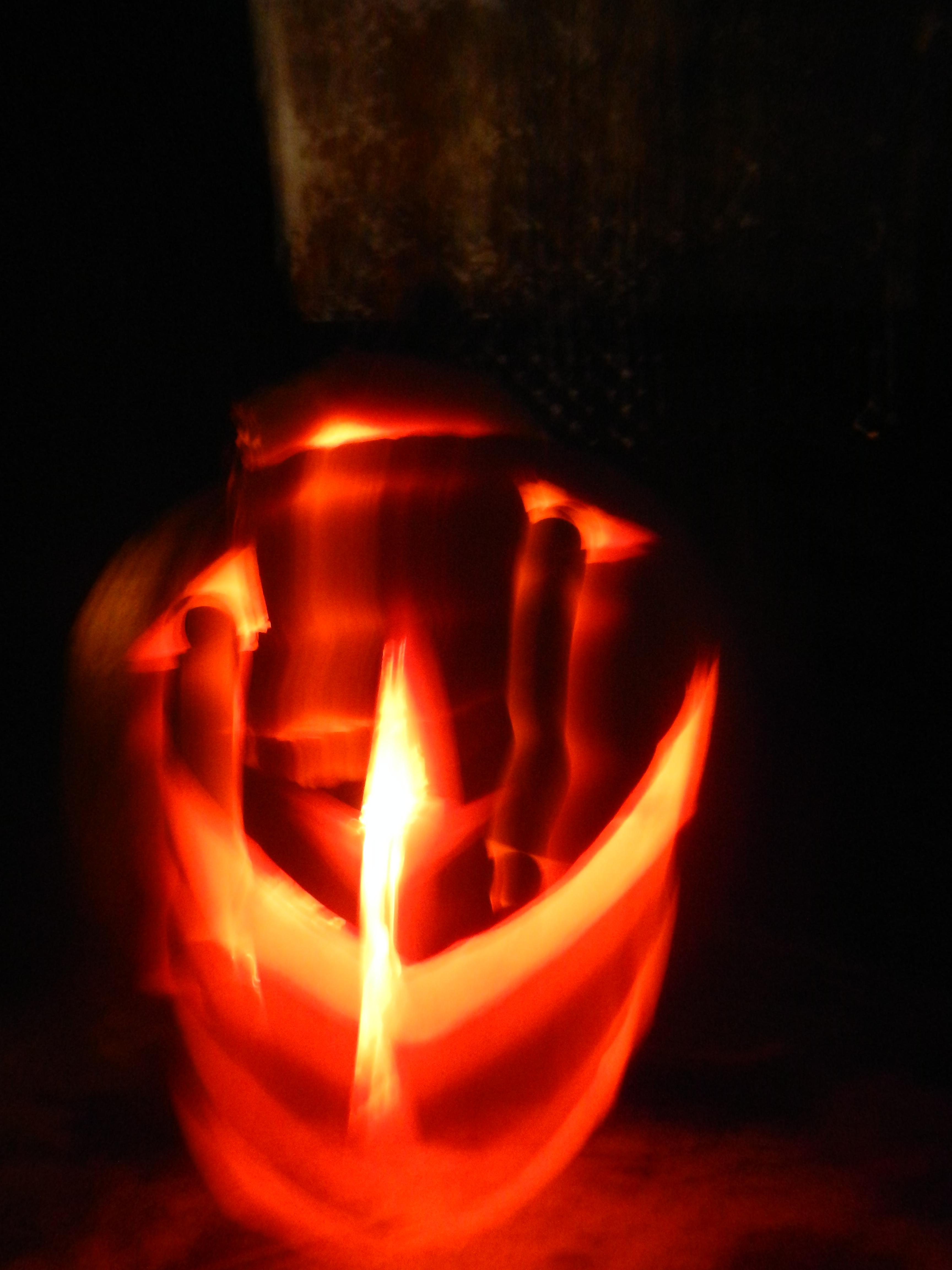 The origin of Jack-o’-Lantern carving is in Ireland, and the pre-Christian festival of Samhain.  Samhain (which is the Gaelic word for November) hinges on the end of the harvest / Celtic old year, and the beginning of Winter / Celtic new year.  For a few hours all Spirits, including our ancestors, may run free, back and forth between “this” world and the “other”).  In old Eire it was the dependable turnip that was hollowed out, and a candle placed within. Positioned at a cottage threshold, or upon a window ledge, the glowing turnip “face” would announce to roving Spirits – some of which might’ve meant harm – that this was a house protected and not to be tampered with. Sometimes coins were inserted as “lucky eyes”, in case any malevolent invisible-now-visible Beings of Samhain needed to steal something away: better they take two pieces of silver than to carry off a calf or sicken to death the smallest child.