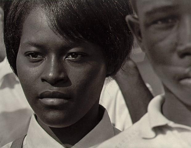 It’s of a young woman whose face is at once relaxed and intense. She is apparently in bright sunshine, but both her face and the rest of the picture give off a feeling of modulated darkness; we can see her beautiful features, but they are underlit somehow. Only later did I learn the picture’s title, “Mississippi Freedom Marcher, Washington, D.C., 1963” which helps explain the young woman’s serene and resolute expression. It is an expression suitable for the event she’s attending, the most famous civil rights march of them all. The title also confirms the sense that she’s standing in a great crowd, even though we see only half of one other person’s face (a boy’s, indistinct in the foreground) and, behind the young woman, the barest suggestion of two other bodies.