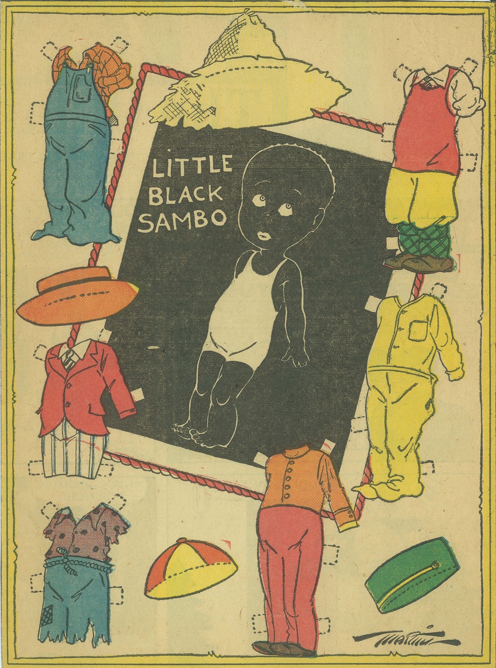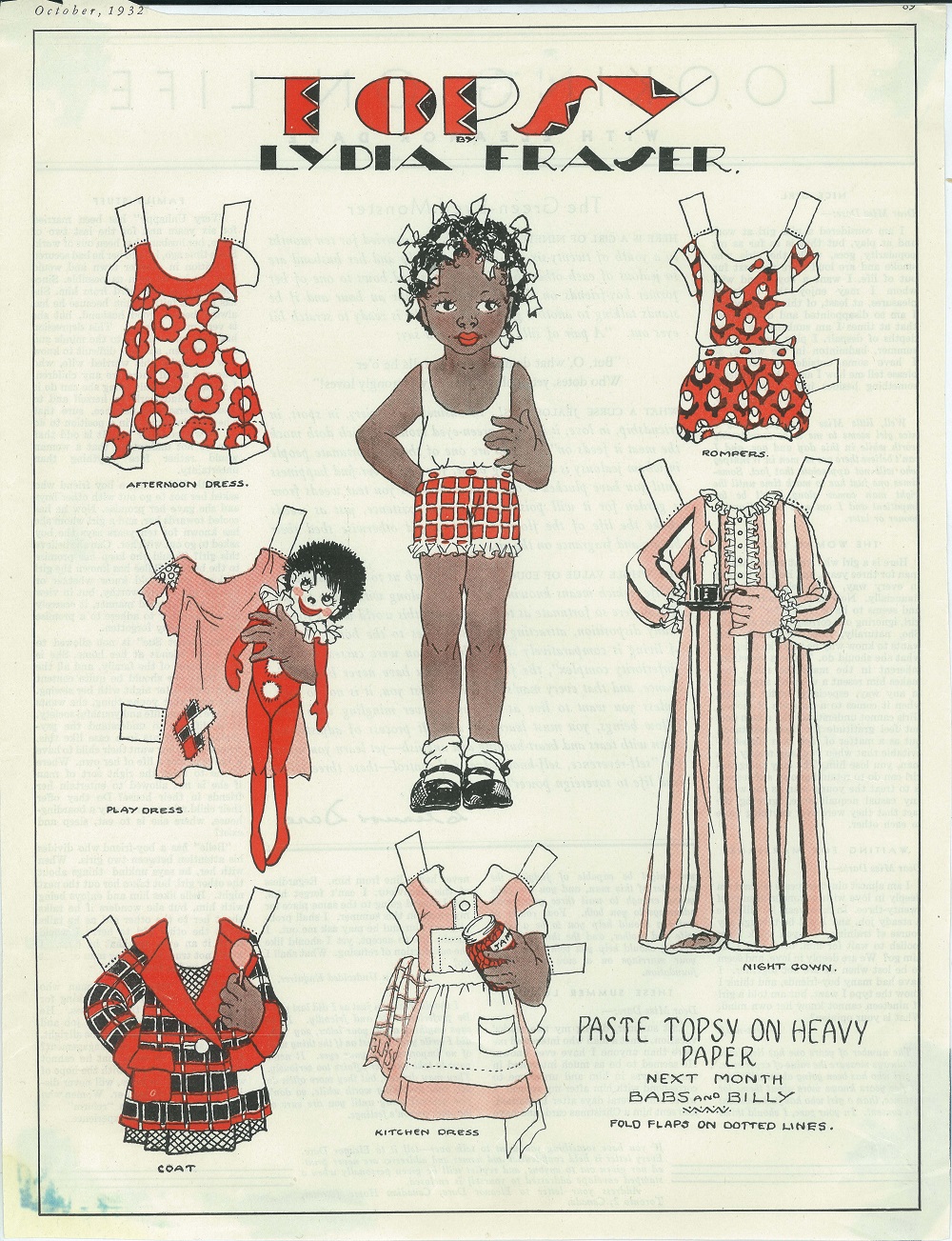 From the late 1800s to the mid 1950s, black paper dolls were rare and stereotypical in white-owned North-American media. Black adult females were shown as maids or ‘mammies’, caregivers to young white children. Black children as paper dolls always had at least one garment that was tattered and patched, and black adult males were almost never shown.