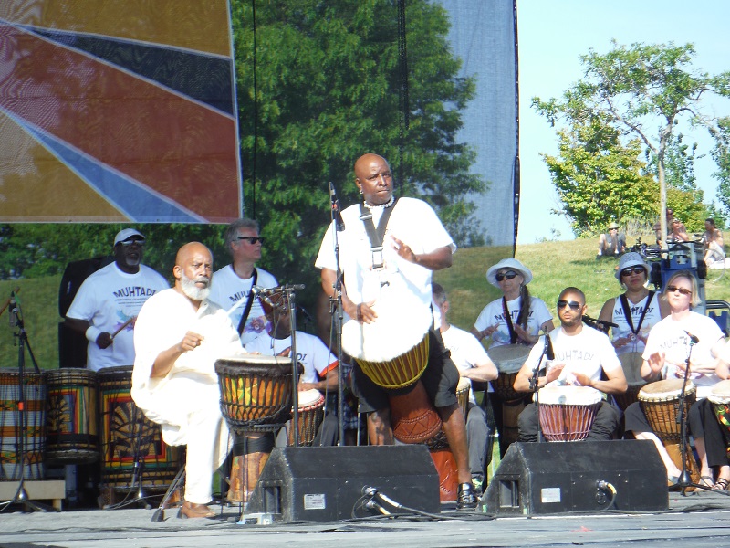 Muhtadi Thomas, seated at front left, performs with his World Drummers ensemble at Woodbine Park in Toronto_June 4th, 2016