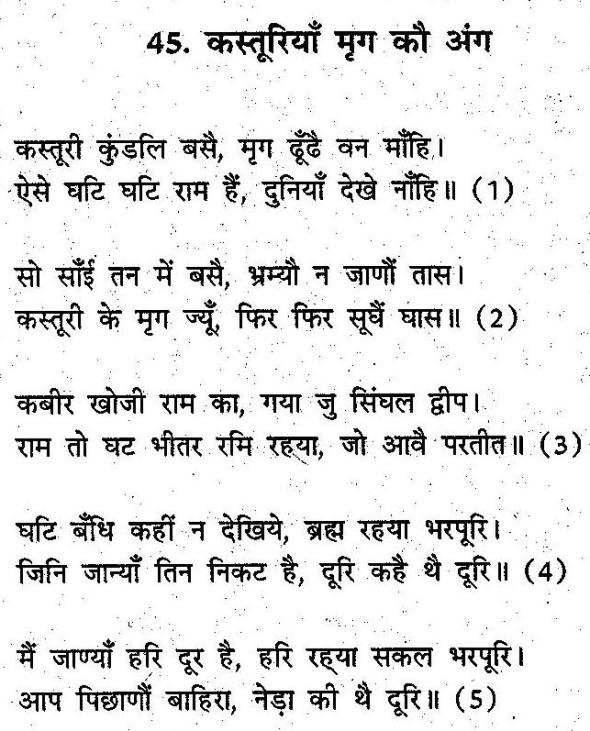 Posted: April 11, 2012 Filed under: English, Hindi, Kabir Comments Off on कबीर Kabir: “Of the Musk Deer”: 15th-century Hindi poems